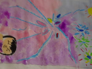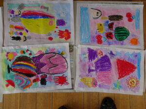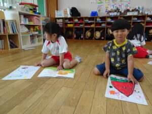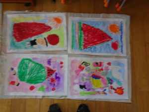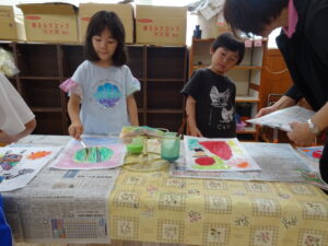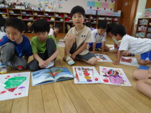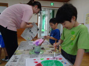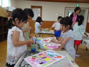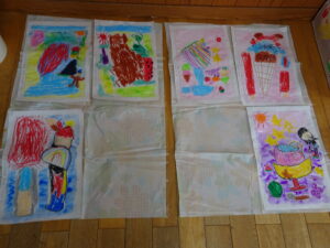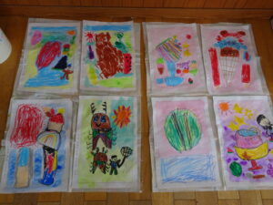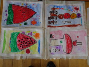 照国神社の六月燈の燈ろうの絵を制作しました。夏の雰囲気が出るような楽しい絵を描きました。この絵を燈ろうの枠に一枚ずつ貼ってもらい照国神社の境内に飾られる燈ろうになります。