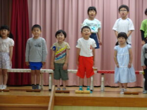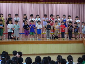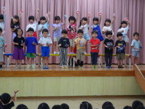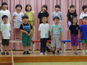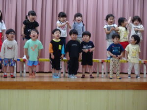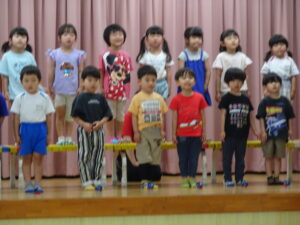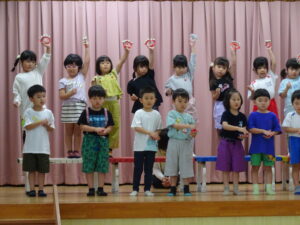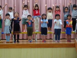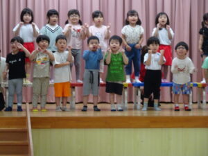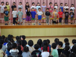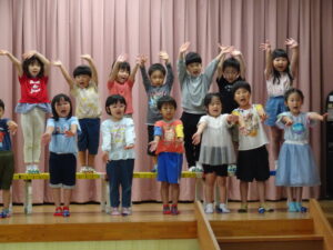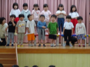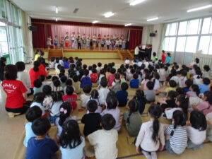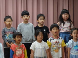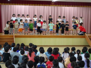 「楽しく歌おう」集会が開かれました。昨年度より一ヶ月早い開催になりましたが、子どもたちは合奏や合唱曲を楽しく発表できました。年長さんは、タンバリン、ウッドブロック、鈴、カスタネット、トライアングルなど5つの楽器を使って「線路は続くよどこまでも」や「大きな古時計」と、年中さんは2つの楽器を使って「時計の歌」「かたつむり」を演奏し、合奏のほか1曲ずつ歌もうたいました。年少さんは、合唱曲「アイスクリーム」「あくしゅでこんにちは」、「あたま、かた、ひざ、ぽん」「お花がわらった」を2曲ずつ発表しました。みんな楽しく発表できました。