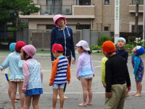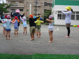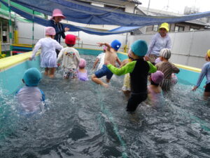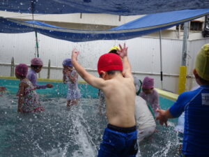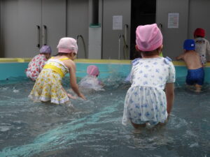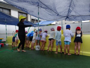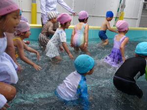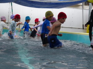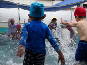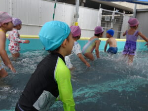 年中さんのプール遊びが始まりました。今日は小雨が降り水温も低かったので、年中さんのプール遊びは時間を短縮して実施しました。アヒルさん歩きやうさぎさん歩きをしたり、友達と水かけしたりして遊びました。7月15日(火)までプール遊びが続きます。