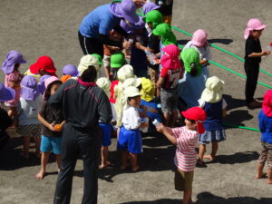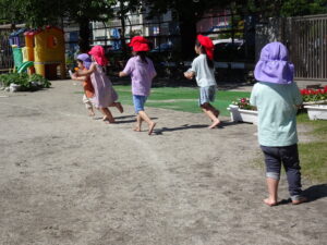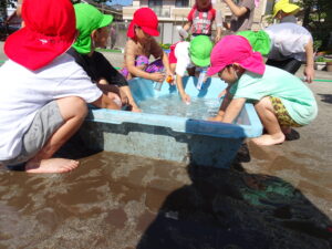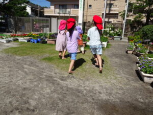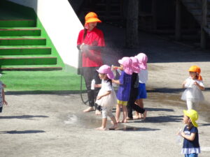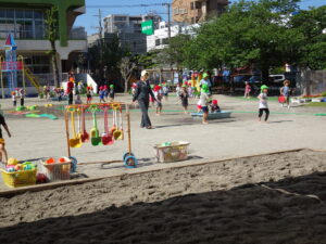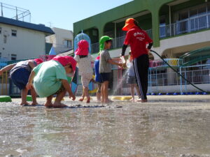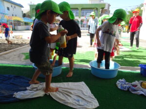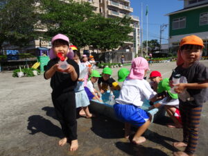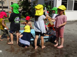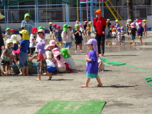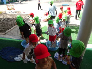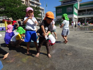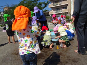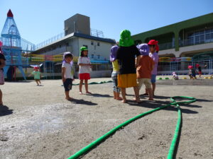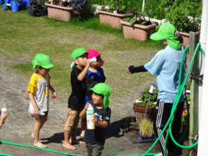 6月からは、幼児の健康増進のため素足での活動が始まります。6月4日は久しぶりの快晴。園庭では、からになったペットボトルやマヨネーズの容器に水をいっぱい詰めて、友達と水をかけ合う姿が見られました。また、ぬかるんだ園庭で、素足で泥の感触を楽しむ姿。ホースから出る水しぶきでできる虹を探す子ども。楽しい活動1の時間になったようです。