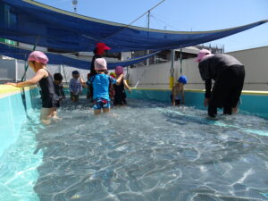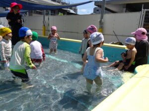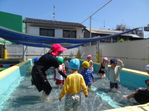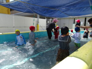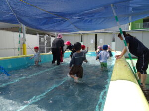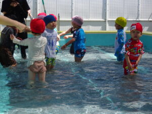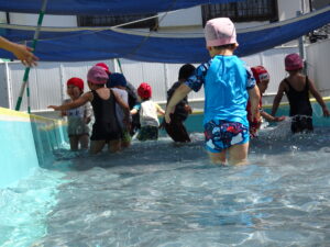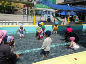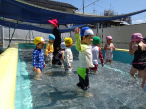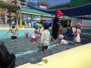 年少さくら組さんの初めてのプール遊びが始まりました。今日は夏を思わせるような快晴。朝からさくら組さんは水着に着替え、プールの準備をしました。水の中を歩いたり水かけっこしたりして遊びました。水の中ではしゃぐには、もう少しかかりそうです。7月15日(火)までプール遊びが続きます。