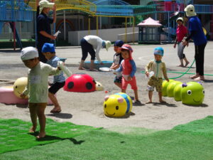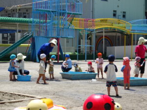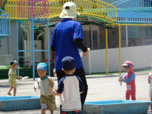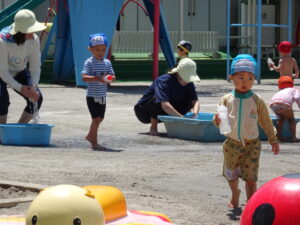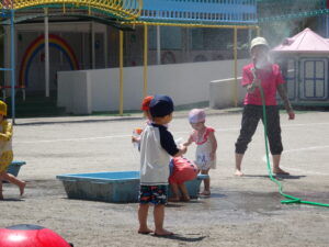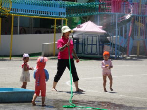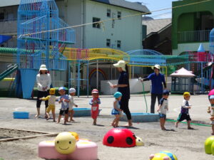 年少々ちゅうりっぷ1組さんの初めての水遊びが始まりました。今日(6月5日)は夏を思わせるような快晴。朝からちゅうりっぷ組さんは水着に着替え、水遊びの準備をしました。ホースで水をかけられたり、容器に入れた水をかけっこしたりして遊びました。顔に水をかけられたりするのは、もう少し時間がかかりそうです。7月15日(火)までプール遊びが続きます。